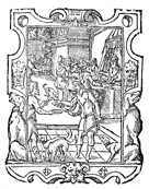 Description: In this woodcut print, the artist depicts the leper Lazarus begging for food from what appears to be one of the servants of the rich man. In the background, the rich man feasts in the background with his dinner party.
