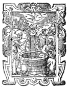 Description: In this woodcut print, the artist depicts Jesus’ meeting with the Samaritan woman at Jacob’s well. The woman draws water from the well as Jesus addresses her and his disciples discuss among themselves the significance of this encounter.