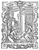 Description: In this woodcut print, the artist depicts Jesus kneeling before Peter with a water basin for washing the latter’s feet as the rest of the disciples look on.