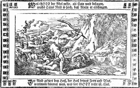 Description: Cain (right) and Abel each present an offering to God, while in the foreground Cain murders Abel in a fit of jealousy after God prefers his brother’s offering to his own.