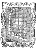 Description: In this woodcut print, the artist depicts Peter asleep in prison, guarded by two soldiers. An angel taps Peter on his side and orders him to get up.