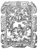 Description: In this woodcut print, the artist depicts the heavenly worship of God as described in the book of Revelation. God sits on a throne surrounded by the seven lampstands; the four living creatures; and the heavenly elders, who yield their crowns to him. At the right hand of God stands the lamb, which symbolizes Jesus and appears to take the scroll with the seven seals from the lap of God. John is in the foreground among the heavenly elders.