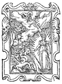 Description: In this woodcut print, the artist combines several scenes from the book of Revelation: the portent of the woman, the portent of the dragon, God’s reception of the woman’s child, the angel Michael’s fight with the dragon, and the dragon’s attempt to sweep away the woman in the flood poured from its mouth.