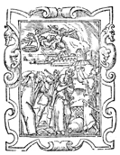 Description: In this woodcut print, the artist depicts the proclamation of the fall of Babylon as described in the Book of Revelation. At the top of the image, an angel proclaims the city’s demise to the merchants and kings of the earth below. Another angel is about to cast a millstone into the sea, an act symbolizing the expedition with which God will execute his judgment on the city. The city of Babylon occupies the background of the image.