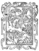 Description: In this woodcut print, the artist depicts the scene of Armageddon as described in the Book of Revelation. The Word of God rides down the kings of the earth as they attempt to flee. At the top of the image, the “angel standing in the sun” sends carrion birds to feed on the flesh of the slain kings and their armies. At the bottom, flames of the lake of fire engulf the beast.