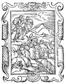 Description: In this woodcut print, the artist depicts John standing on a mountain with an angel holding a gold measuring rod. The angel shows him the New Jerusalem, which lies in the valley below.