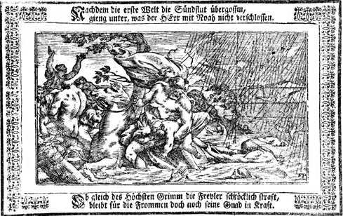 Description: The ark protects those inside (background), while others try to escape the rising floodwaters. The initials of the artist or engraver (FP) have been placed in the lower right corner.
