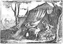 Description: After his army is destroyed (background left), Sisera eludes Barak and rests in the dwelling of Jael, wife of Heber the Kenite; after Jael comforts him, she drives a tent peg through his temple while he rests.
