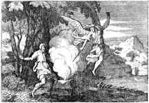 Description: Fire from God consumes Gideon’s sacrifice beneath an oak tree, after an angel touches it with his staff.