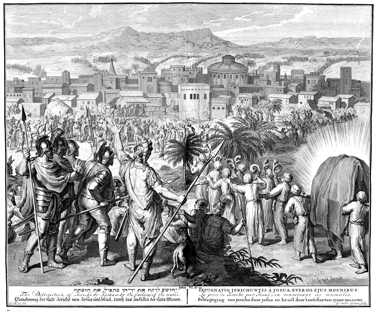Description: Levites bear the ark and trumpet shofars, as Joshua commands the destruction of Jericho after the walls fall. Engraved by G. vander Gouwen (Gouwe) from the design of Gerard Hoet (1648–1733).