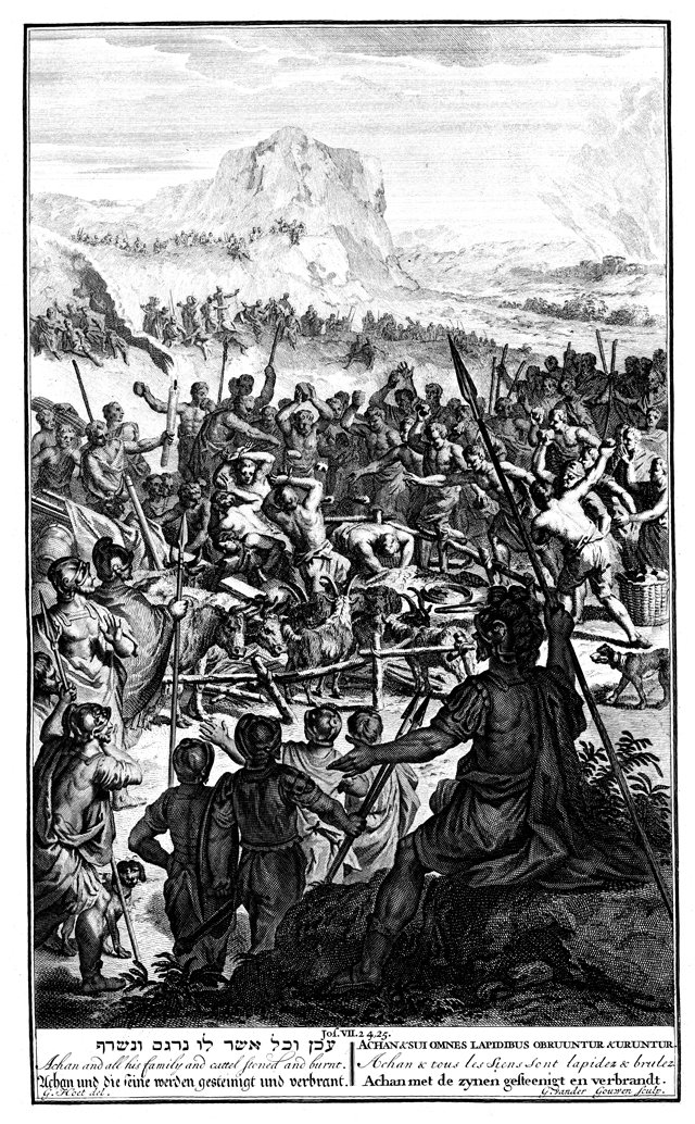 Description: Joshua commands Achan, his goods and his family stoned by the rest of the Israelites. Engraved by G. vander Gouwen (Gouwe) from the design of Gerard Hoet (1648–1733).