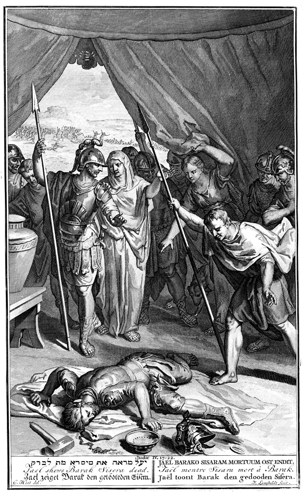 Description: Jael points to the sprawled body of Sisera, tent peg through his temple, showing Deborah and Barak her handiwork. Engraved by Jan Lamsvelt (or Lamsveldt; b. ca. 1660) from the design of Gerard Hoet (1648–1733).