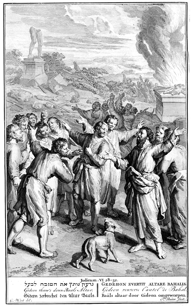 Description: Israelites exclaim in fear, as Gideon rebukes them. An altar burns in the background next to a broken statue and hewn tree. Engraved by Pieter Sluiter (or Sluyter; 1705-1771) from the design of Gerard Hoet (1648–1733).