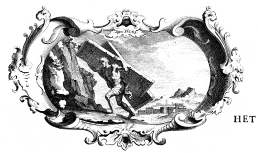 Description: Samson carries away the gates of Gaza on his back. Designed by Bernard Picart (1673-1733).