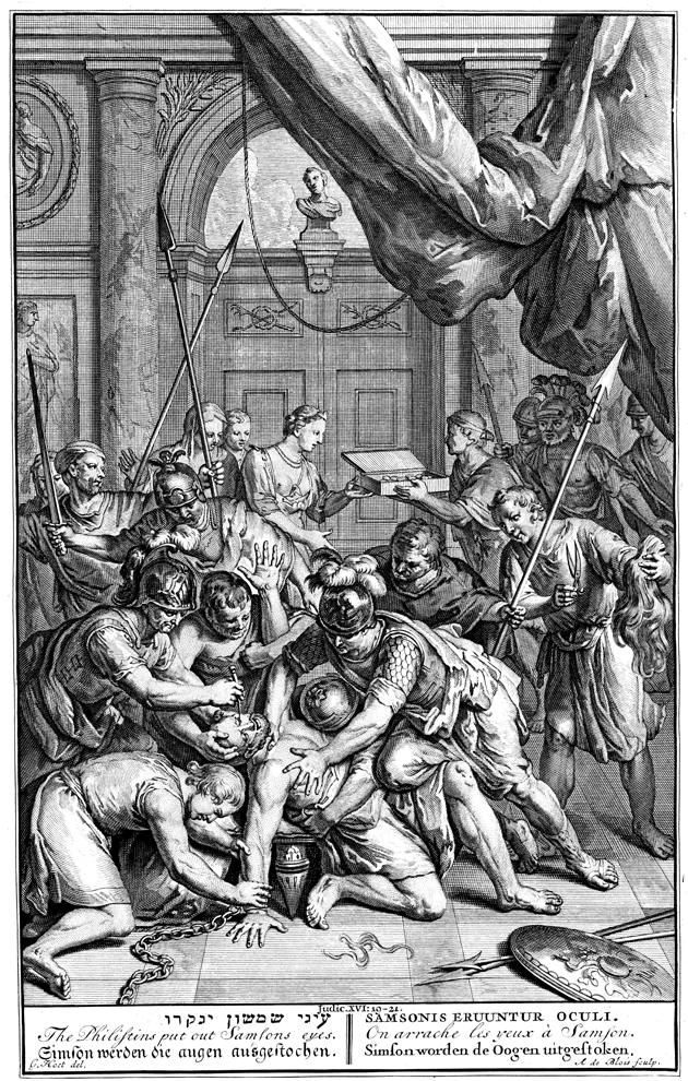 Description: Samson is blinded, while chained and held down by a crowd. Engraved by Abraham de Blois (or Bloys; fl. 1690-1720) from the design of Gerard Hoet (1648–1733).