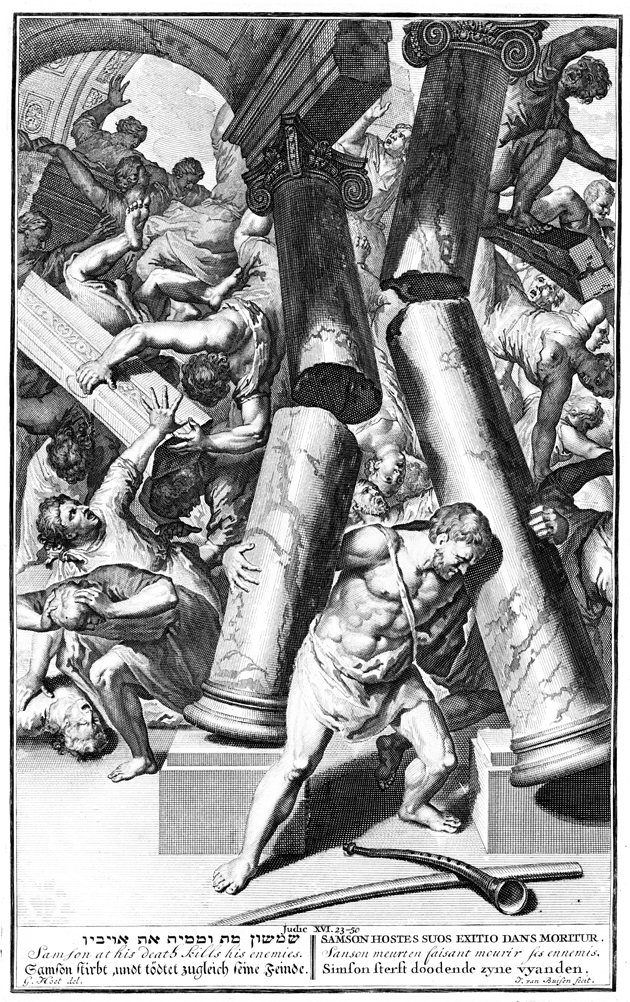 Description: Samson grips two pillars, as the temple of Dagon crashes down around him, killing himself and all the others inside. Engraved by Jan de Buisen from the design of Gerard Hoet (1648–1733).