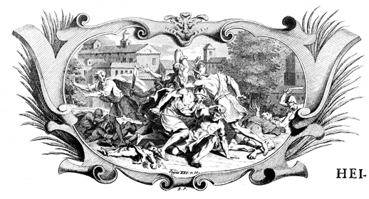 Description: The Benjamites slay the men of Jabesh in order to steal their women. Designed by Bernard Picart (1673-1733).