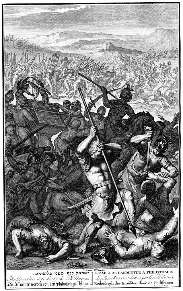 Description: The Philistines take control of the Ark of the Covenant, as a larger battle rages in the background. Engraved by Andries van Buis (Buisen, Buysen) from the design of Gerard Hoet (1648–1733).