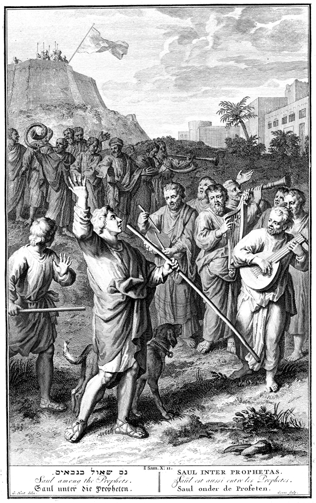 Description: Saul lifts his arms heavenward, while surrounded by prophets playing a variety of musical instruments. Engraved by G. vander Gouwen (Gouwe) from the design of Gerard Hoet (1648–1733).