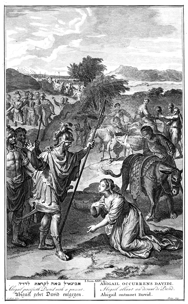 Description: Abigail kneels before David and his host. Engraved by Pieter Sluiter (or Sluyter; 1705-1771) from the design of Gerard Hoet (1648–1733).