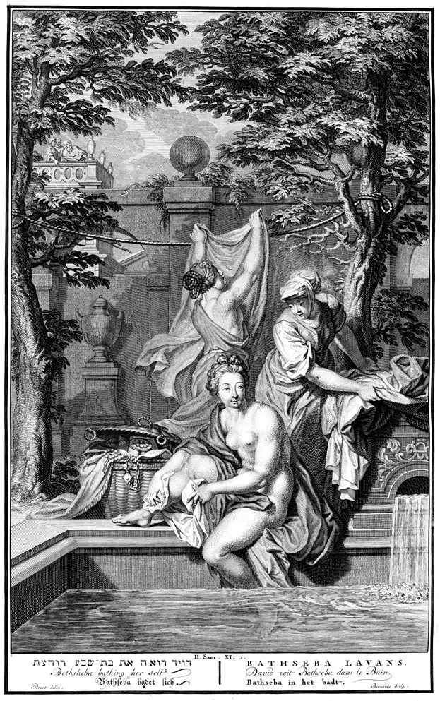 Description: Bathsheba enters her bath attended by two serving women, one of whom hangs a privacy curtain. In a distant background tower David and two other men observe her. Engraved by Bernards from the design of Bernard Picart (1673-1733).