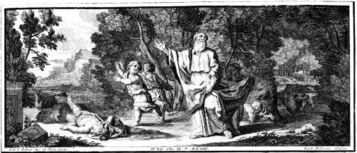 Description: Elisha summons bears to maul the boys who mocked him. Engraved by Jacob Folkema from the design of Gabriel Francois Louis Debrie.