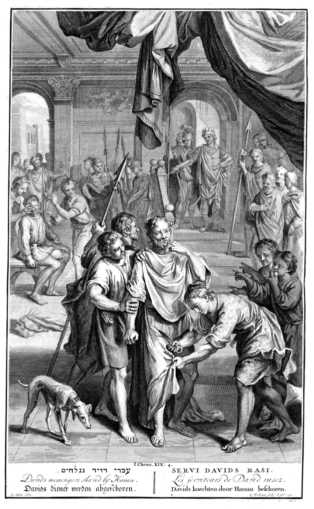 Description: Hanun’s servants shame David’s envoys by shaving them and cutting their garments. Engraved by L. Fonbonne from the design of Gerard Hoet (1648–1733).