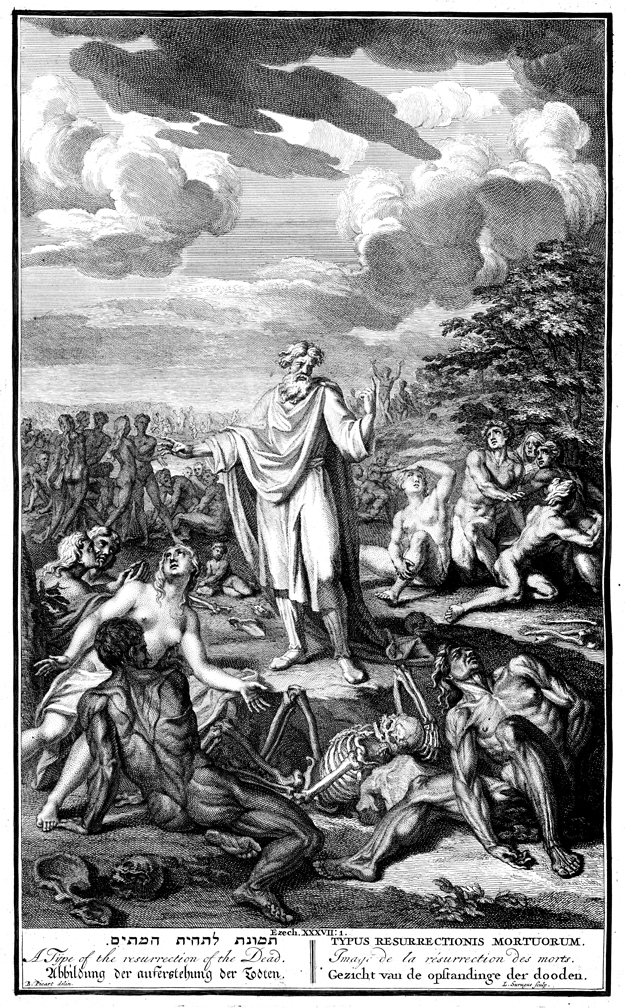 Description: Ezekiel stands in the midst of the living and dead bones and points to the luminous sky. Engraved by Louis Surugue (de Surgis) from the design of Bernard Picart (1673-1733).