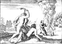 Description: Cain and Abel present an offering to God (background), while in the foreground Cain murders Abel in a fit of jealousy after God prefers his brother’s offering to his own.