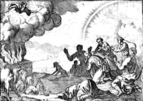 Description: Noah makes a sacrifice to God following the flood, while God (depicted in the smoke of Noah’s offering) places a rainbow in the sky as a sign of his pledge to never again destroy the earth by flood. The artist’s or engraver’s monogram, AZ, has been placed in the bottom center.