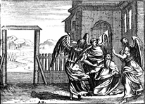 Description: After Abraham’s three visitors inform him of God’s plan to destroy Sodom and Gomorrah, he pleads with them to spare the cities if ten righteous people can be found. The artist’s or engraver’s monogram, AZ, has been placed in the bottom center.