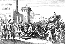 Description: After interpreting Pharaoh’s dreams, Joseph is promoted to vice-regent in Egypt and given Pharaoh’s chariot in which to ride throughout the land, as the people in the streets bow to him. The artist’s or engraver’s initials (AZ) have been placed along the bottom.