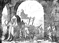 Description: A burial procession of Joseph’s family and Pharaoh’s court accompanies Jacob’s body from Egypt to the land of Canaan. The artist’s or engraver’s initials (AZ) have been placed on the bottom left.