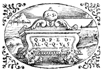 Description: An ornamental tailpiece featuring two lions beneath a monument.