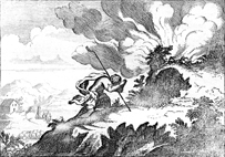 Description: God speaks to Moses from the burning bush, as Moses bows and removes his sandals. The artist’s or engraver’s initials (AZ) have been placed on the bottom left.
