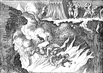 Description: Korah, Abiram, Dathan, and their followers and family are swallowed by the earth for revolting against Moses. The artist’s or engraver’s initials (AZ) have been placed along the bottom.