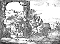 Description: Balaam beats his donkey for stopping as an angel stands in its way with sword raised. The artist’s or engraver’s initials (AZ) have been placed on the bottom left.