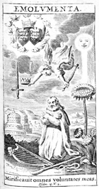 Description: As Israelite king David kneels facing his harp, sling, sling-stones, and other items, an angel swoops down from heaven, and more gifts—a sword, a crown, a tambourine—come raining down. Flying together under a single crown, two hearts represent human will and divine will and bear the respective messages “Accipe, Redde, Fuge” (“Receive [benefit], Return [thanks], Avoid [anything opposed to divine will]”) and “Quod vult Deus” (“What God wishes”). The caption, a quotation of David from Psalm 16:3 (though Vulgate chapter 15 is identified, as is verse 2), treats divine blessing: “Mirificavit omnes voluntates meas” (“He has made wonderful all my wishes”).