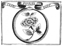 Description: A snake encircles an image of a rose. The rose is the queen of the flowers; therefore it represents the Virgin Mary who is the queen of the women. A Latin phrase is placed at the top that reads CASTO PERFUSA RUBORE (“through modesty the color mounts in her cheeks”).