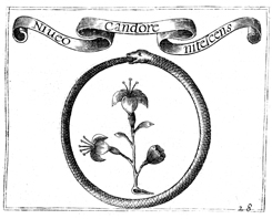 Description: A lily, the symbol of the Virgin Mary, is encircled by a snake. A Latin inscription reads NIUEO CANDORE NITESCENS (“snowy whiteness shines”), a reference to the purity of the Virgin Mary.