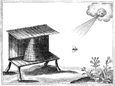 Description: A small cloud is blowing wind on a bee that flew from a beehive that is sitting on a wooden structure. The bee represents the Virgin Mary and the hive her sacred womb. The blowing wind represents adversity.