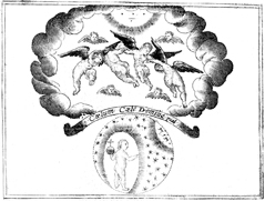 Description: A group of angels fly above a young child inside a circle. A Latin inscription reads COELUM COELI DOMINIA PSAL (“The heavens, even the heavens, are the Lord’s”). The angels here represent heaven, as the Virgin Mary symbolizes heaven on earth.