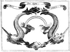 Description: Two dragons connect over a rainbow. A Latin inscription reads PACIS FERO SIGNA FUTURE (“I bring peace to the future”). The rainbow symbolizes God’s promise not to destroy the world by flood again, and the Virgin Mary, as Jesus’ mother, also symbolizes God’s promise to humanity.