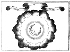 Description: A circle of clouds surrounds the moon. A Latin inscription reads BENIGNA ET FACILIS (“gentle and easy”), which represents how the Virgin Mary treats the people of God.