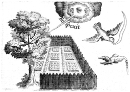 Description: A garden is depicted with several birds flying overhead. A cloud with human characteristics communicates with another bird in a tree. The author compares the flying birds to Eve, who tried to fly as high as God and was expelled from the garden, and the bird in the tree to the Virgin Mary, who humbly accepted God’s will. A Latin inscription reads RESPEXIT (“looked”).