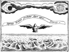 Description: The Holy Spirit in the form of the dove flies over the sea. The sun and moon shine above. A Latin inscription reads SPIRITUS DOMINI FEREBATUR SUPER AQUAS (“and the spirit of God moved upon the waters” from Genesis 1). Here the waters symbolize the Virgin Mary as they become fruitful due to the presence of the Holy Spirit.