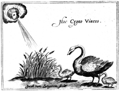 Description: A mother swan and her two cygnets approach a plant as a cloud blows upon it. A Latin inscription reads HOC CYGNO VINCES, which translates to “this swan will conquer”. The mother swan is a symbol for the Virgin Mary and her cygnets represent the believers Mary protects and leads to the light. The engraver, Jacob van Langeren (ca 1525-1610), has placed his signature at the bottom center.