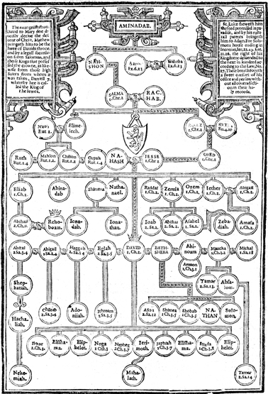 Description: The family tree of Aminadab, son of Ram, son of Hezron, son of Perez, son of Judah, fourth tribe of Israel.
