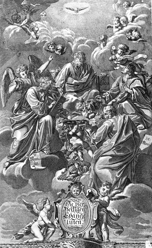 Description: Under the inspiration of the Holy Spirit (depicted as a dove), the four gospel writers write their gospels with their respective attributes nearby.