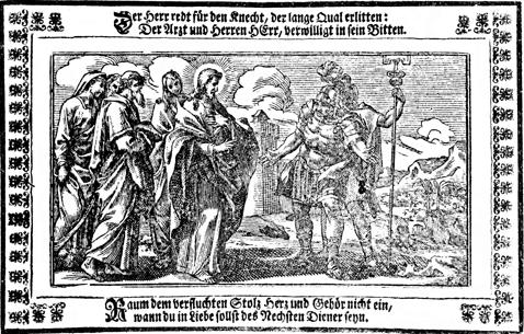 Description: A Roman Centurion asks Jesus to heal his servant. The artist’s or engraver’s initials (EP) have been placed at the bottom right corner.